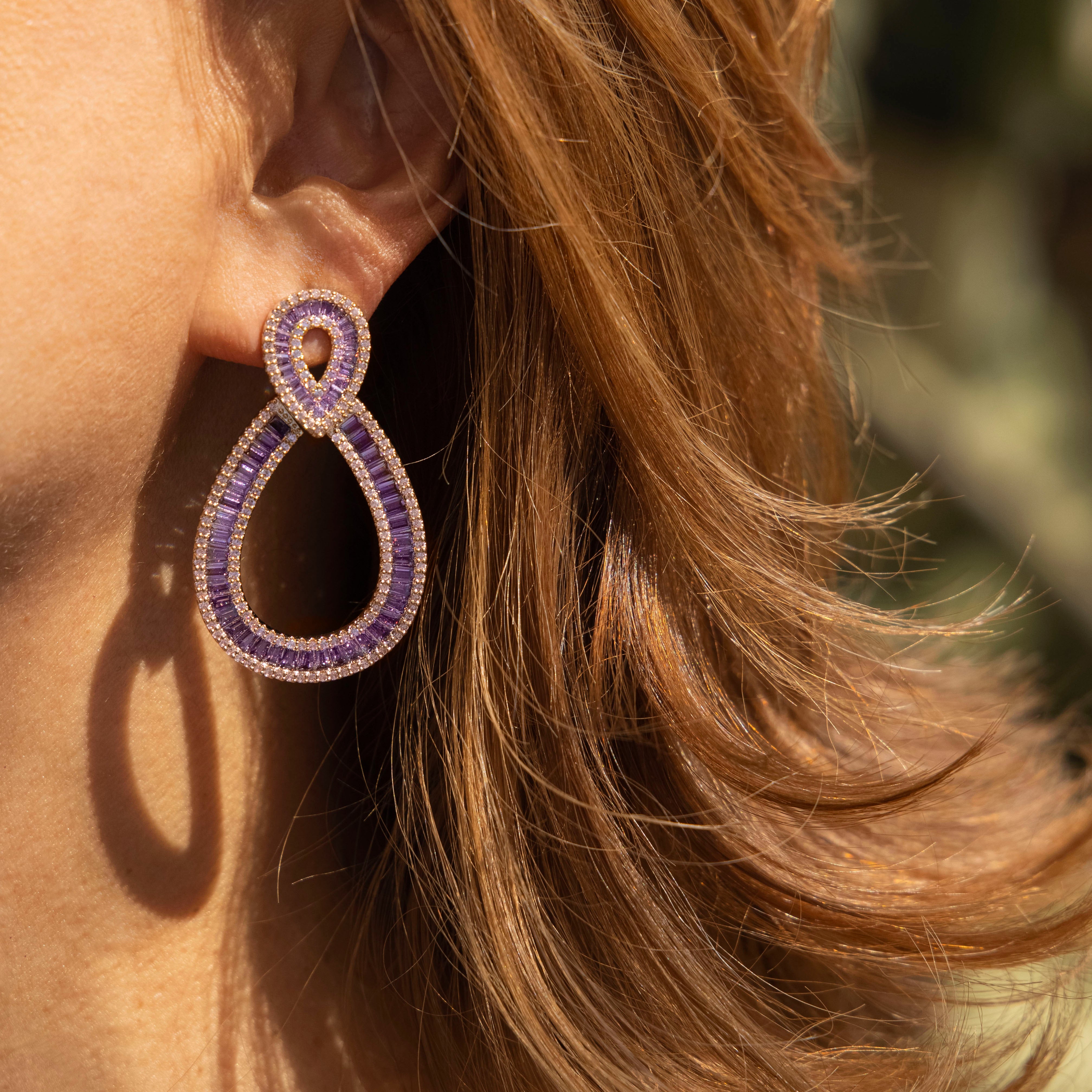 Aretes colgantes gota zirconias baguette morado - chapa de oro 14k
