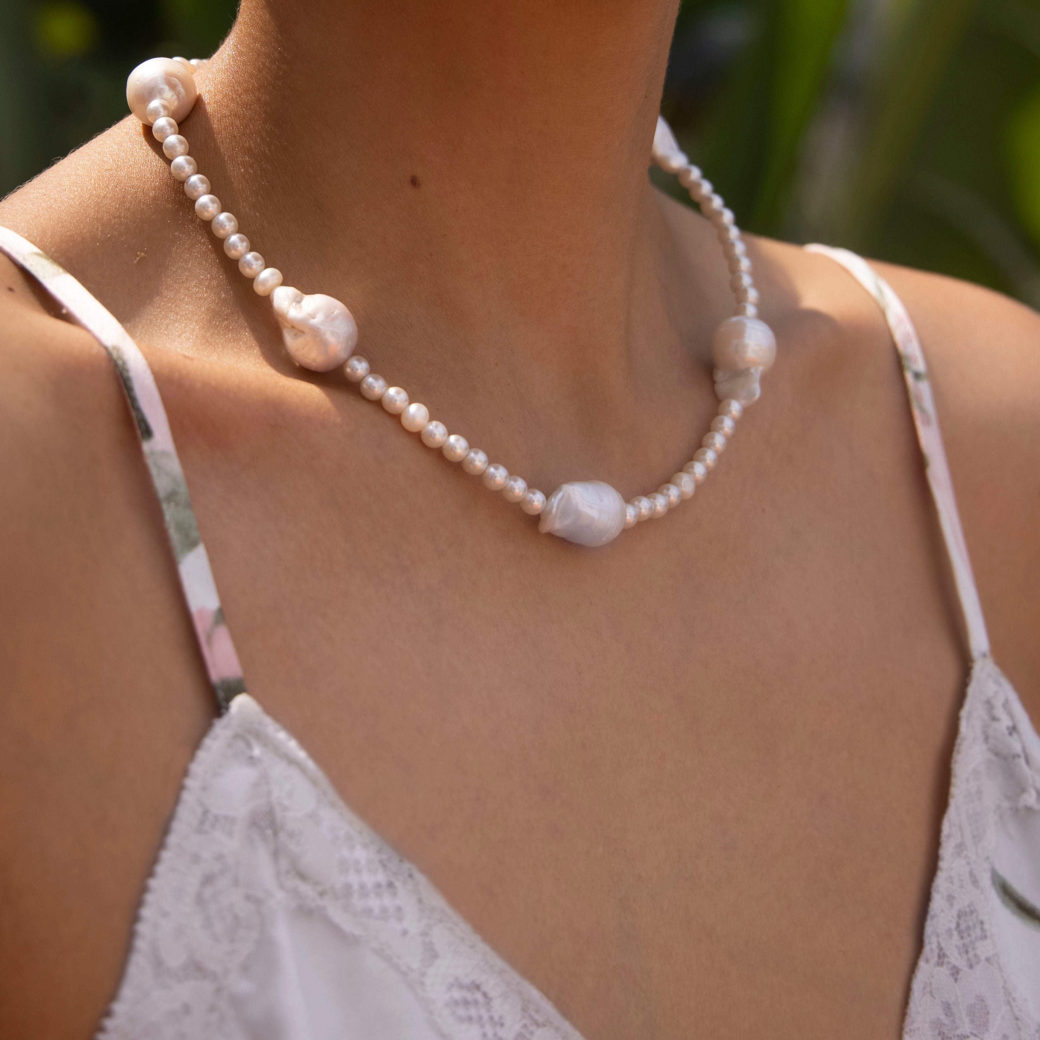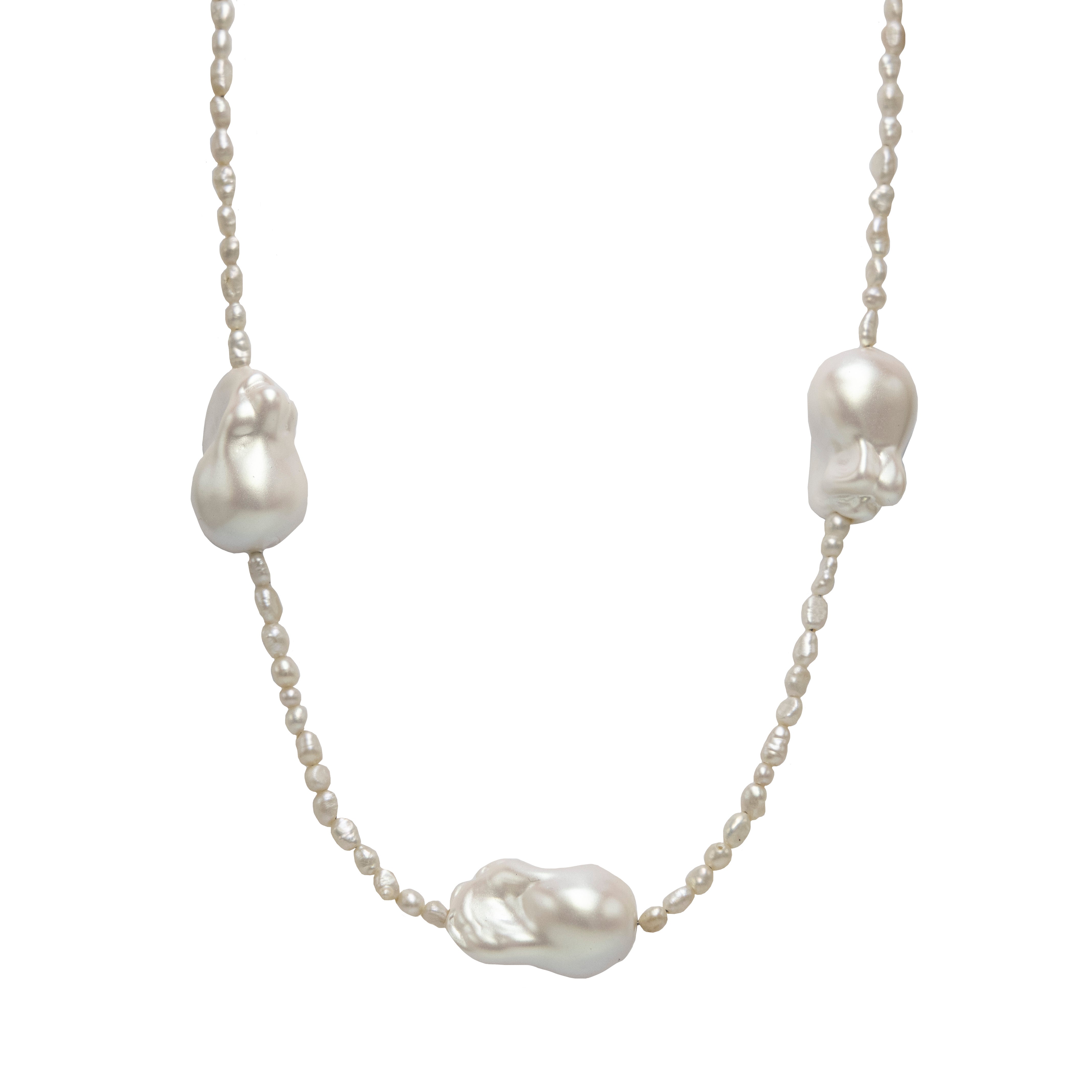 Destaca con nuestro collar corto de tres perlas barrocas en blanco, acompañadas por perlas mini tipo arroz, con un elegante broche de chapa de oro de 14k. La combinación de perlas barrocas y mini arroz crea una estética única, mientras que la chapa de oro añade un toque de lujo a esta pieza distintiva. Perfecto para resaltar tu elegancia con un toque de sofisticación