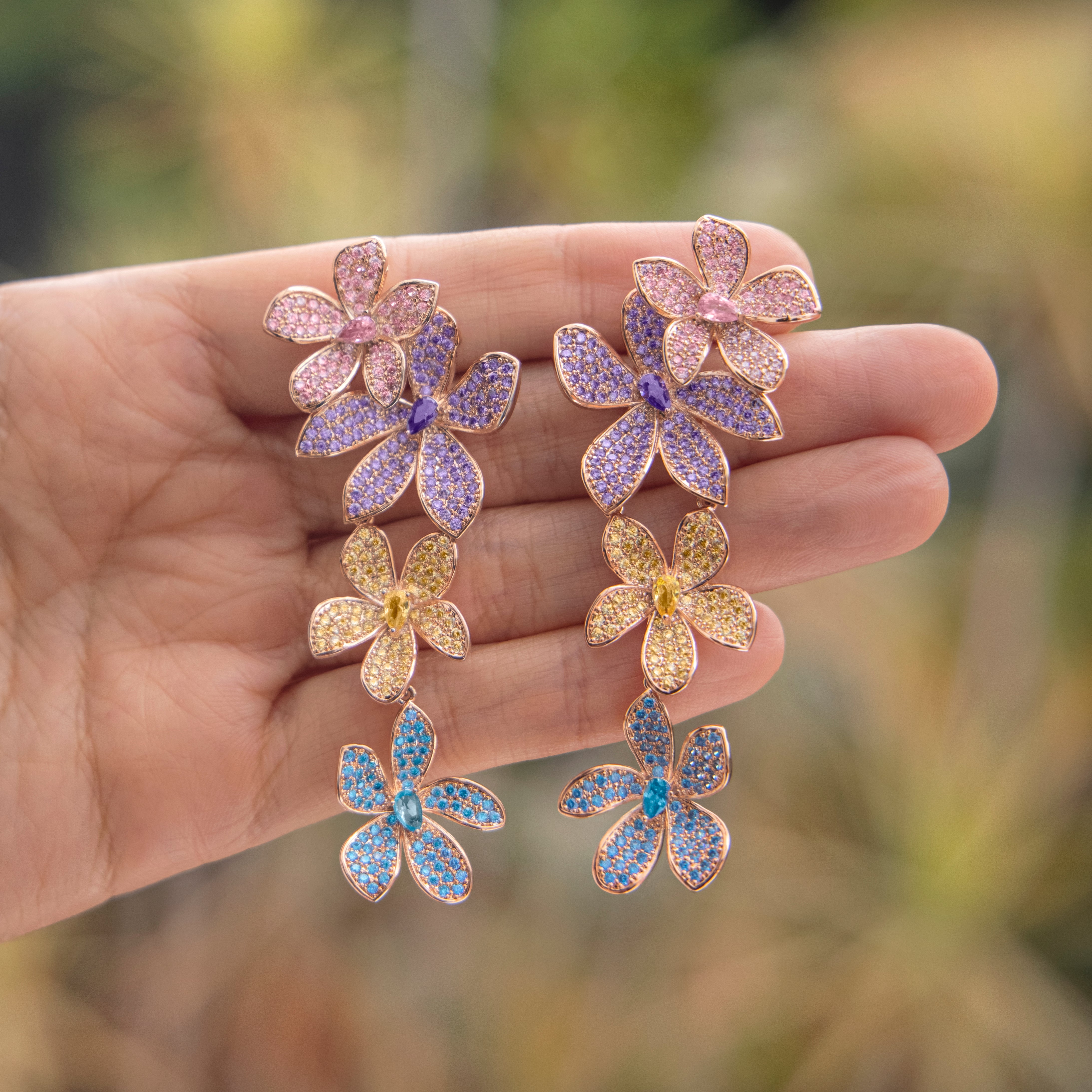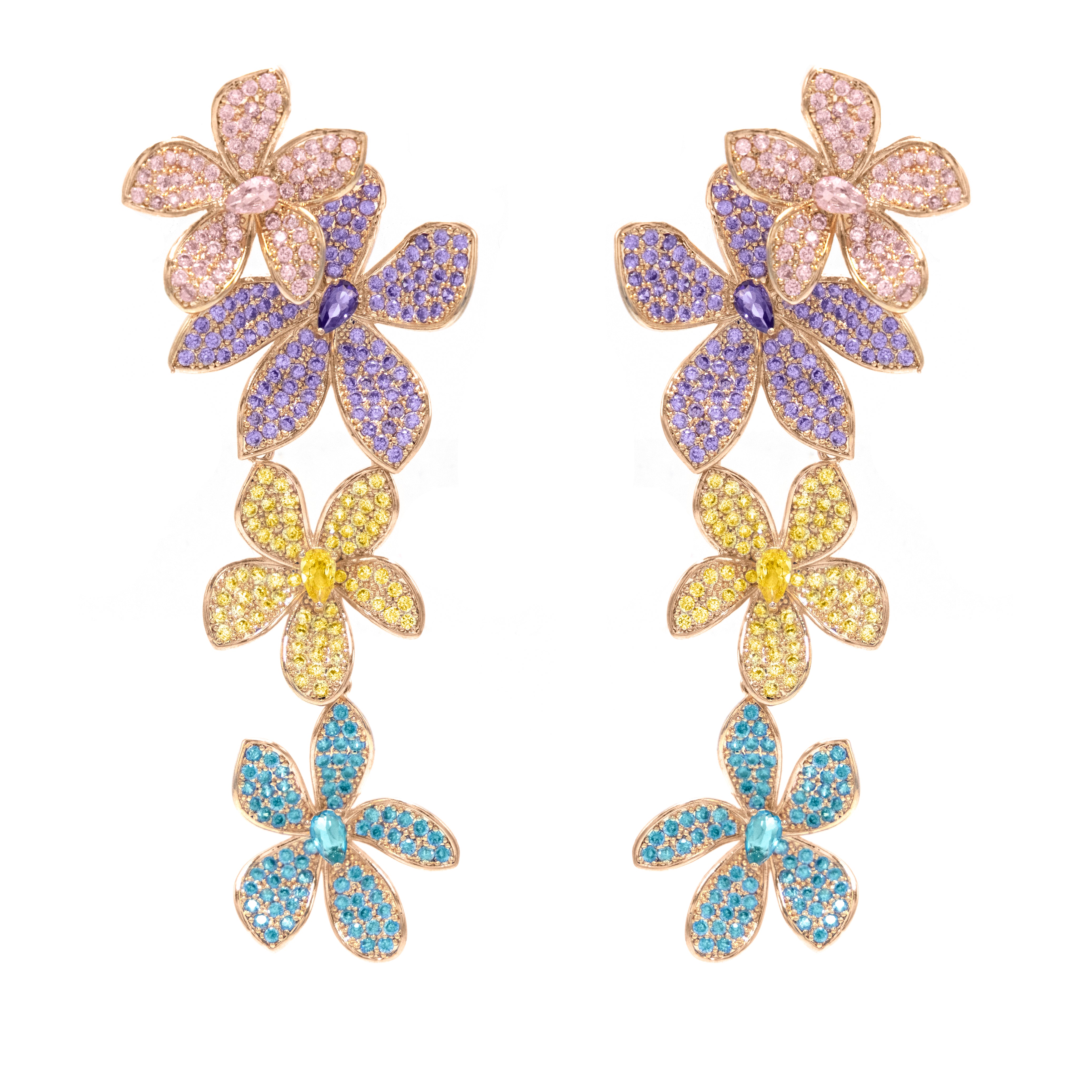 Aretes cascada de flores colores pastel - chapa de oro 14k