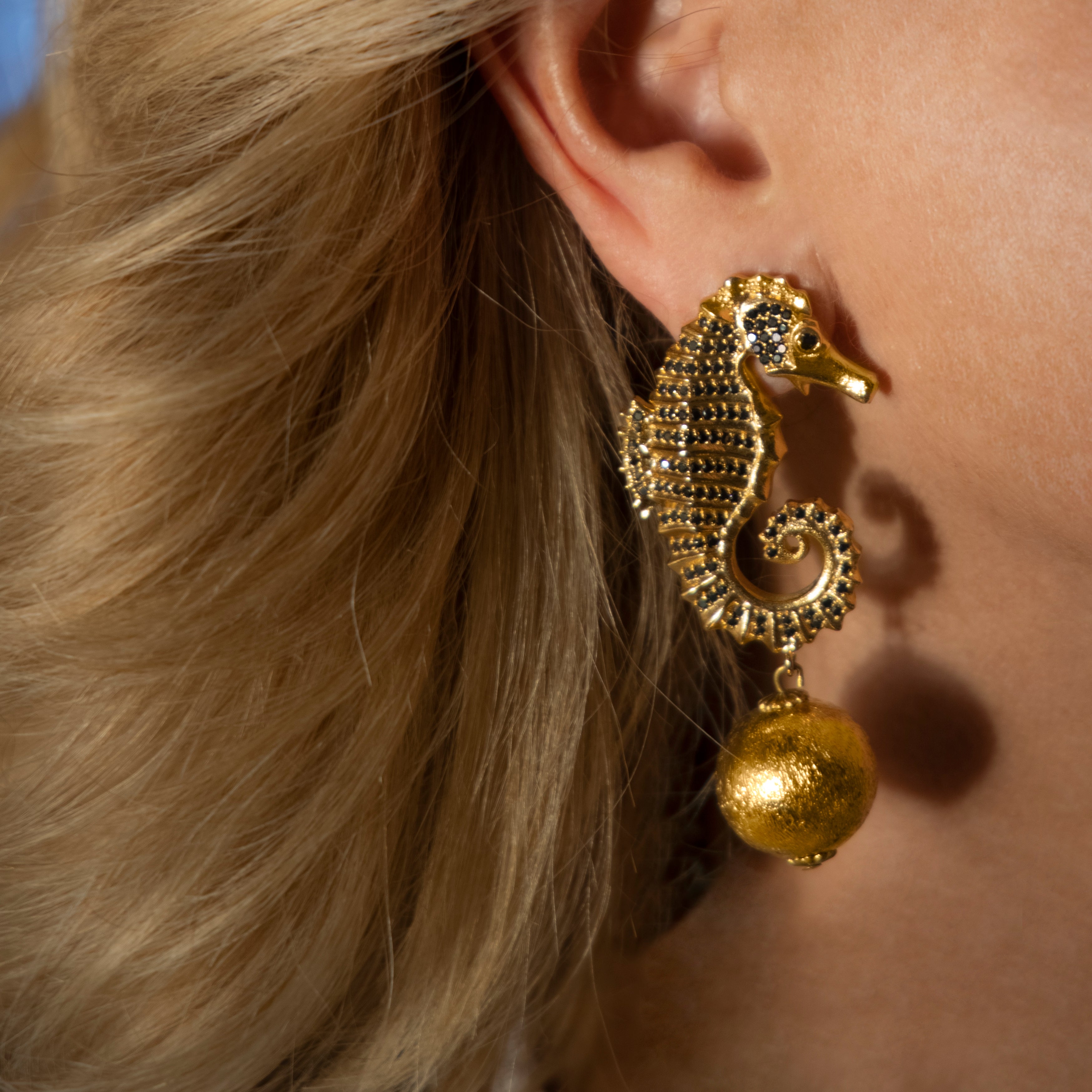 Aretes grandes de caballito de mar dorado - chapa de oro 14k