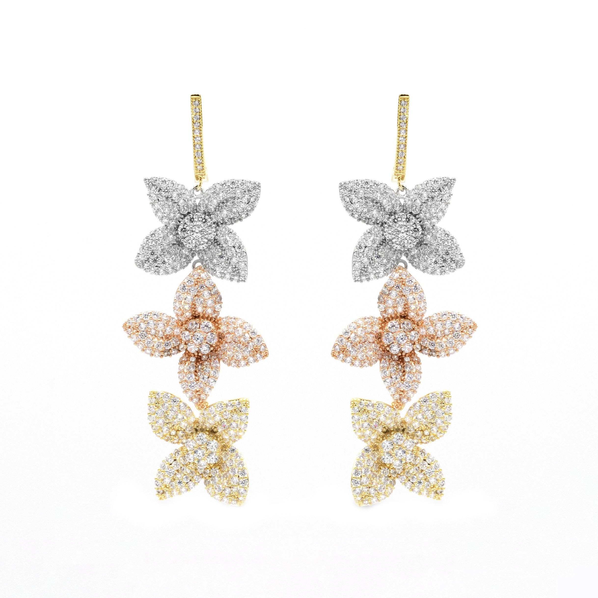 Aretes cascada con 3 flores colgantes plata dorado y oro rosa - chapa de oro 14k