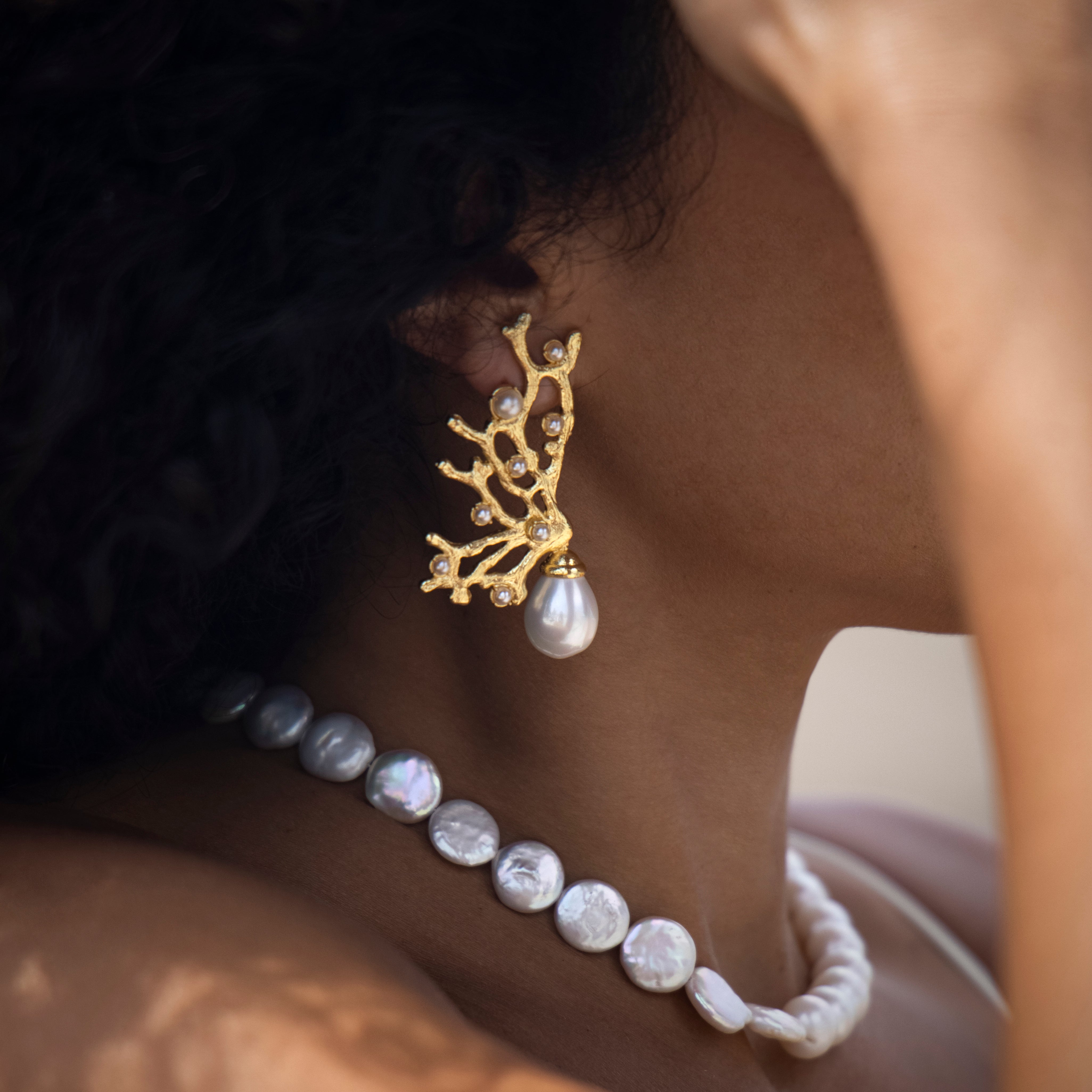 Los aretes grandes de corales dorados y detalles de perlas de imitación son una elección elegante y llamativa. Los corales dorados agregan un toque de lujo y sofisticación, mientras que la chapa de oro de 14k garantiza durabilidad y brillo. Estos aretes son ideales para ocasiones especiales o para elevar tu estilo cotidiano con un toque de glamour.