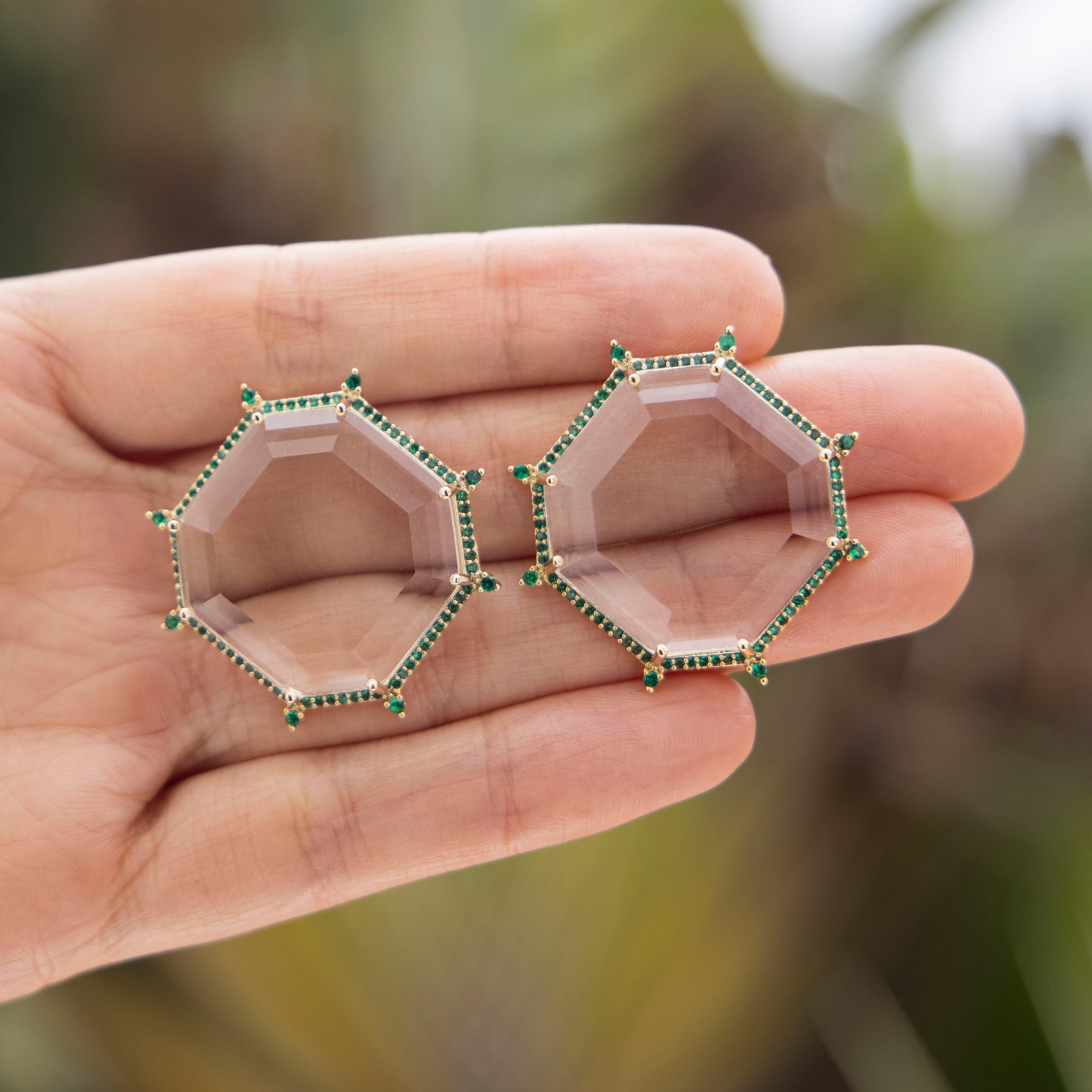 Aretes grandes transparentes con zirconias verde - chapa de oro 14k