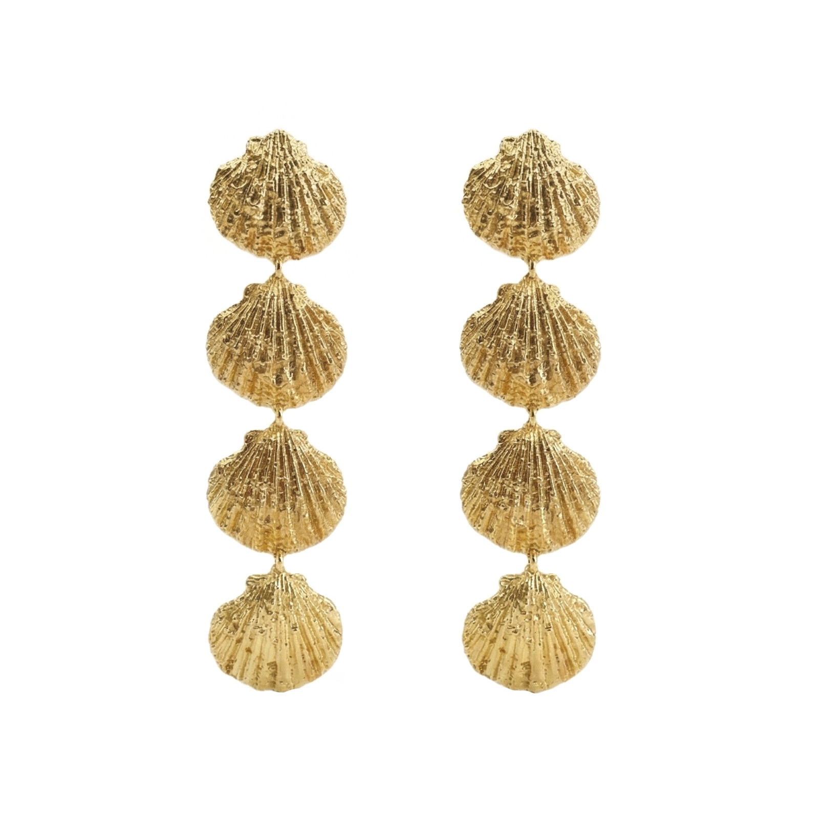 Aretes largos y elegantes con tres conchas colgantes que crean un movimiento delicado y sofisticado. Elaborados con chapa de oro 14k, ofrecen un acabado brillante y duradero que resiste el uso diario. Perfectos para quienes buscan accesorios con estilo bohemio y un toque de lujo. Ideales para complementar cualquier look, desde casual hasta formal.