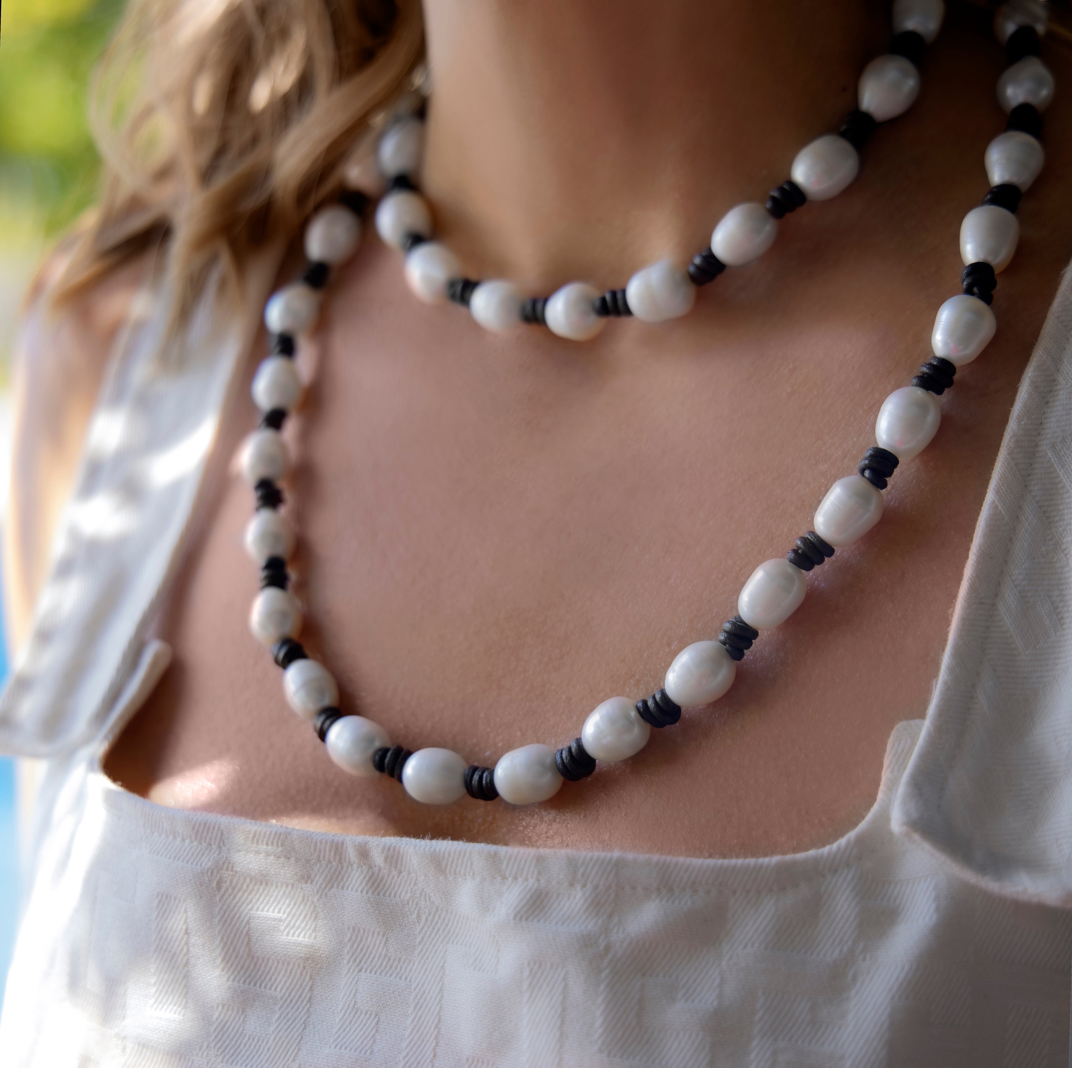 El choker de piel y perlas blancas de Lavanda fusiona elegancia y audacia. Sus suaves nudos de piel se ajustan cómodamente alrededor del cuello, realzando tu estilo con modernidad y sofisticación. Las perlas naturales blancas se entrelazan en el diseño, añadiendo refinamiento y delicadeza. Este collar destaca por su originalidad y belleza única, atrayendo miradas admirativas con su combinación de texturas y sutileza.