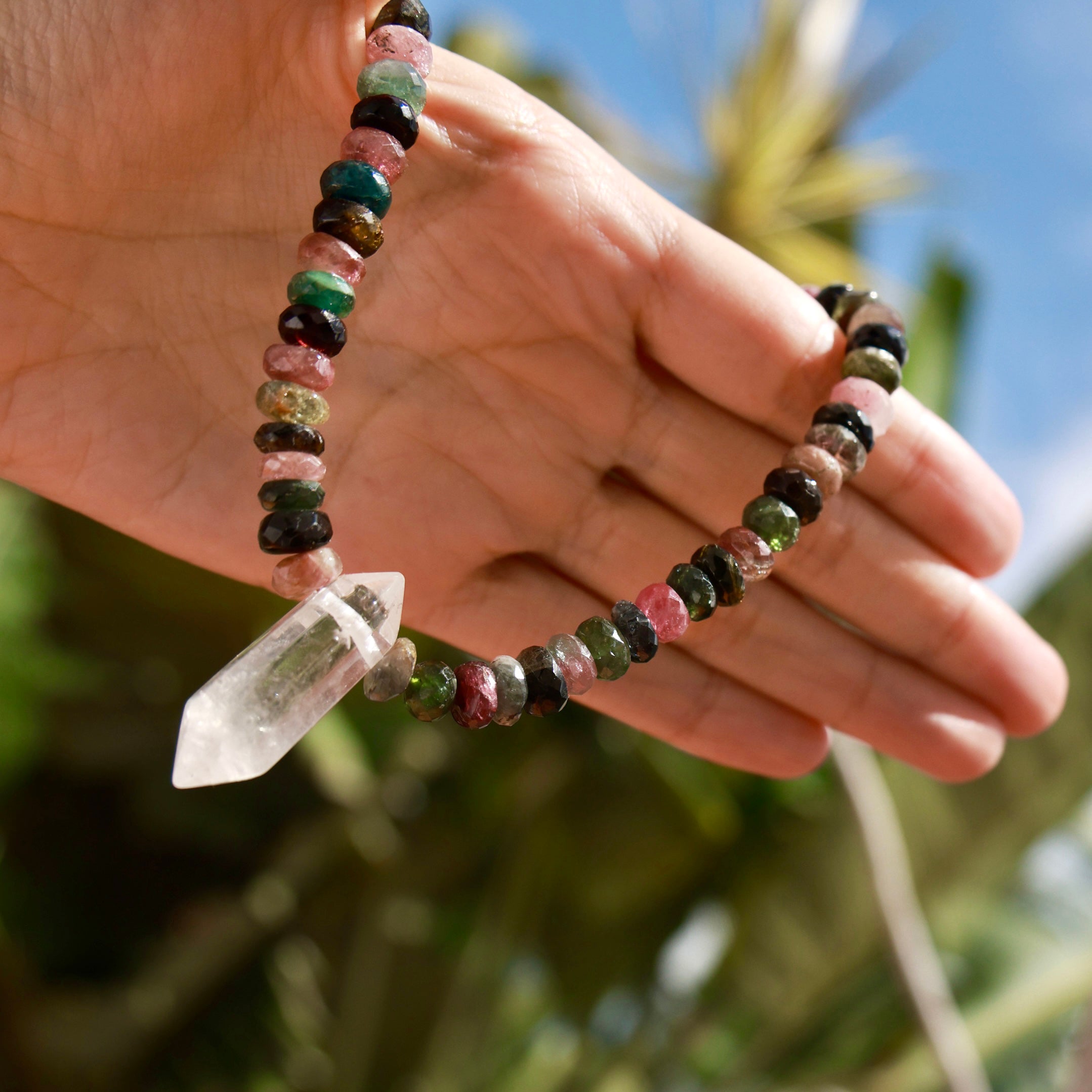 ¡Agrega un toque de color y brillo a tu atuendo con nuestro collar corto de cuarzo blanco y turmalinas! Cuenta con una piedra central de cuarzo blanco y turmalinas de varios colores, ¡perfecto para usar con cualquier look! Con un cierre marinero de chapa de oro, ¡este collar es una verdadera joya!