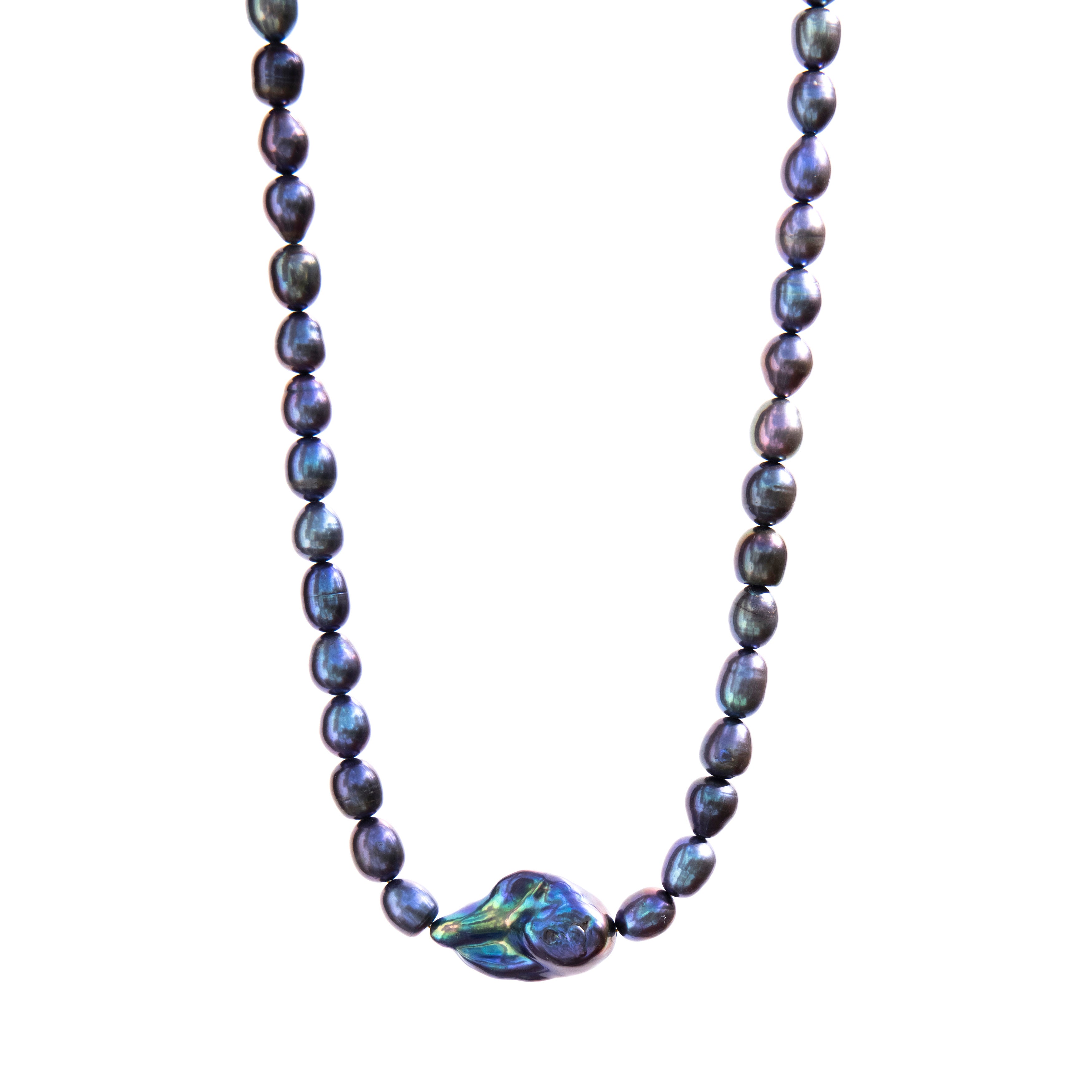 Collar de perlas negras tornasol con un toque de magia. Cada pieza cuenta una historia única gracias a sus perlas ovaladas que juegan con la luz, creando destellos iridiscentes que cambian según el ángulo. La perla barroca central es la estrella del show—irregular, auténtica y completamente natural. Perfecta para quien busca algo diferente, elegante y con personalidad propia. Piedras naturales que brillan con carácter.