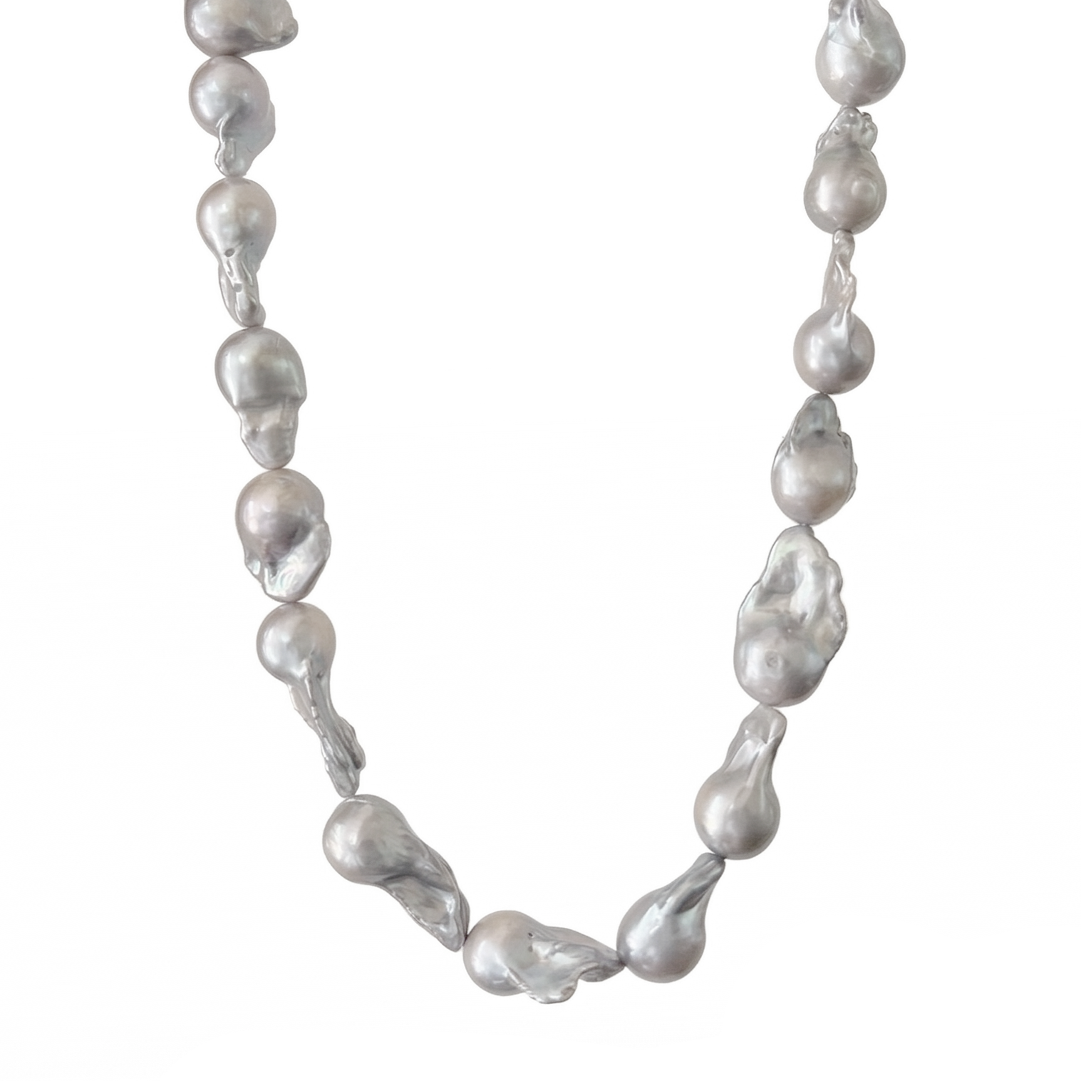 Elegancia orgánica y carácter único en cada detalle. Este collar está elaborado con perlas barrocas naturales, cuidadosamente seleccionadas por sus formas irregulares y su brillo suave y sofisticado. Cada pieza es diferente, lo que convierte a este collar en una joya verdaderamente exclusiva.