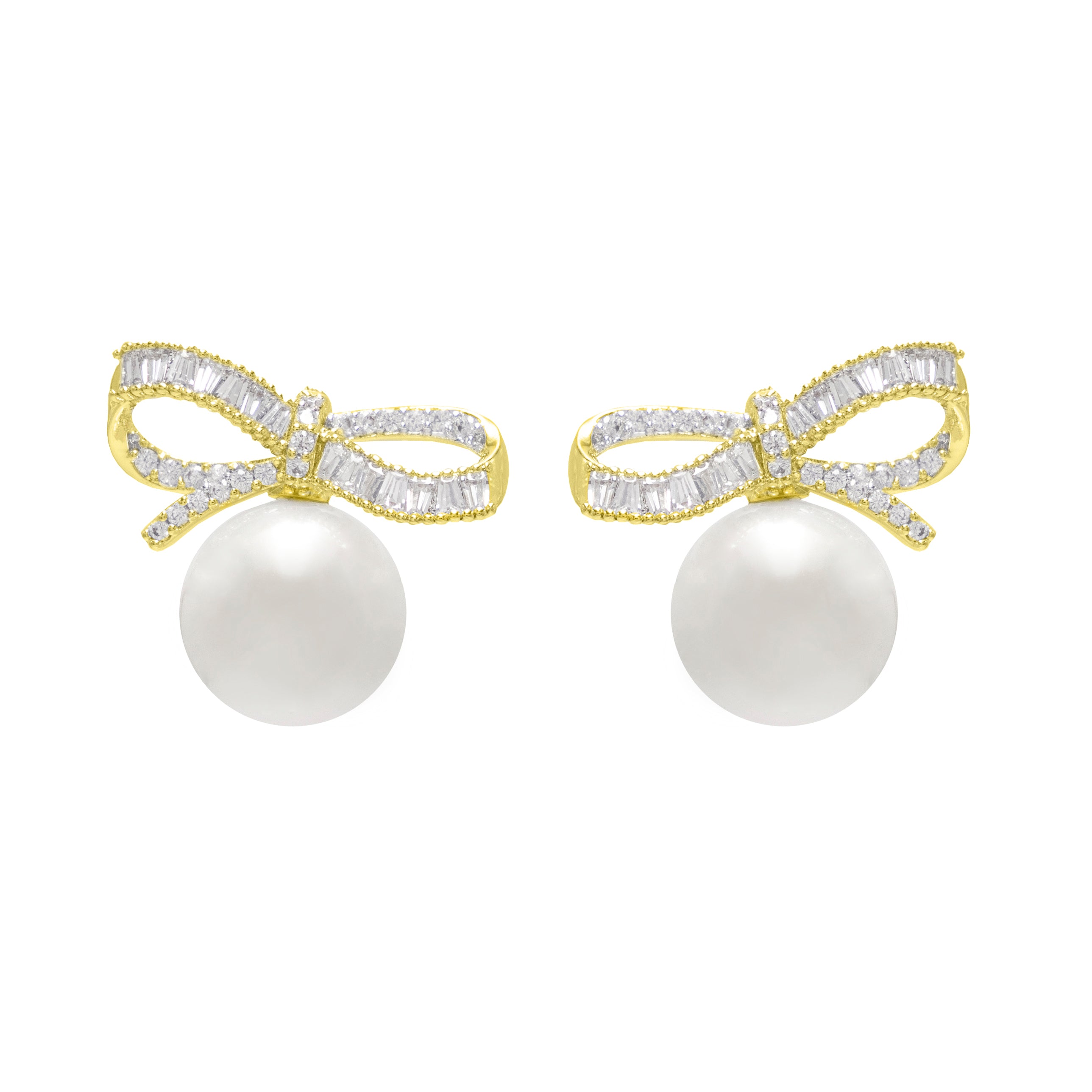 Aretes cortos de perlas y moños de zirconias dorado - chapa de oro 14k
