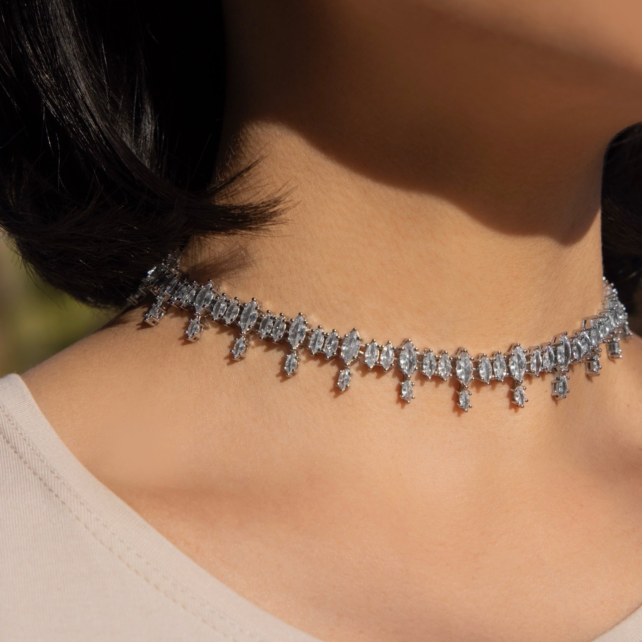 Déjate seducir por el encanto deslumbrante de este choker de Lavanda. Este collar cautivador presenta deslumbrantes zirconias en cortes marquise, que destellan con cada movimiento. Cada colgante marquise cuelga delicadamente, agregando un brillo sutil y sofisticado. Un símbolo de elegancia refinada, este choker captura la atención con su brillo celestial y realza tu estilo con un toque de glamour sin igual.